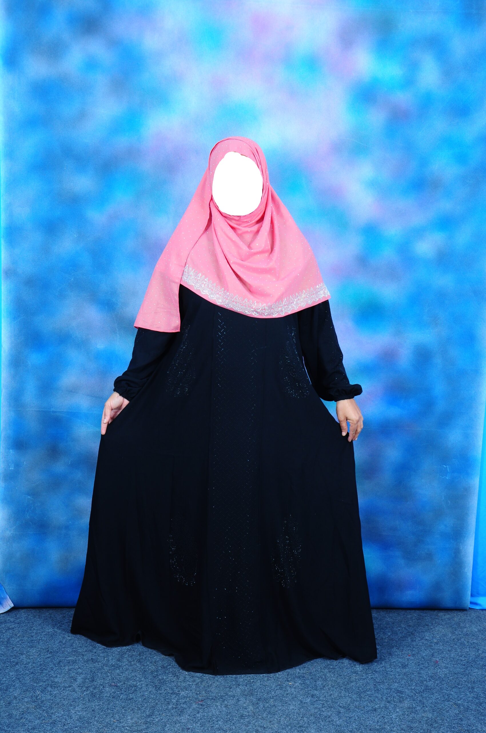 - Highlights:Flowing black abaya with a gentle, all-over shimmer finish